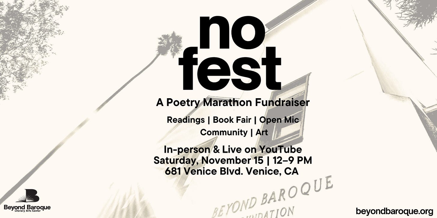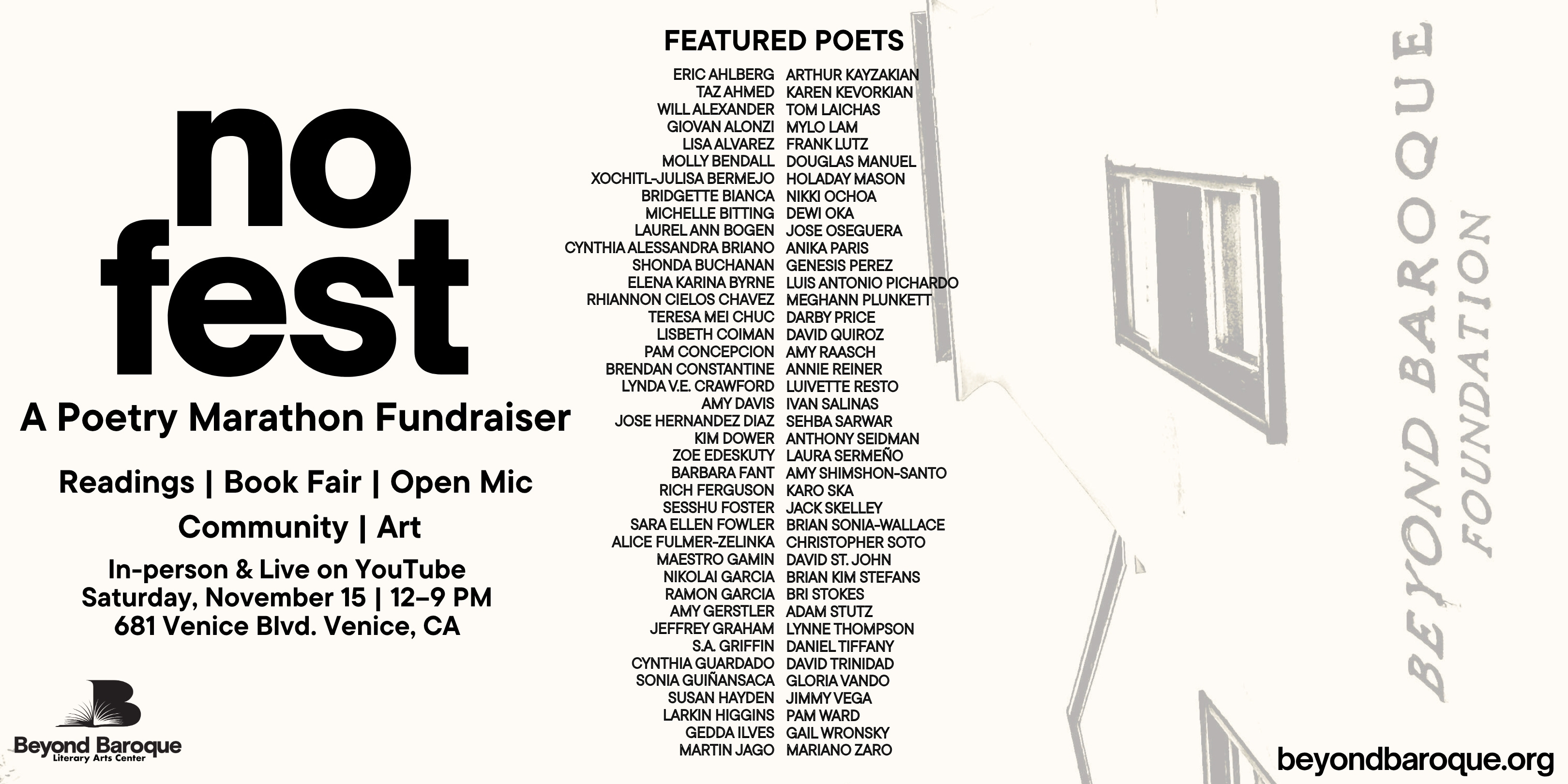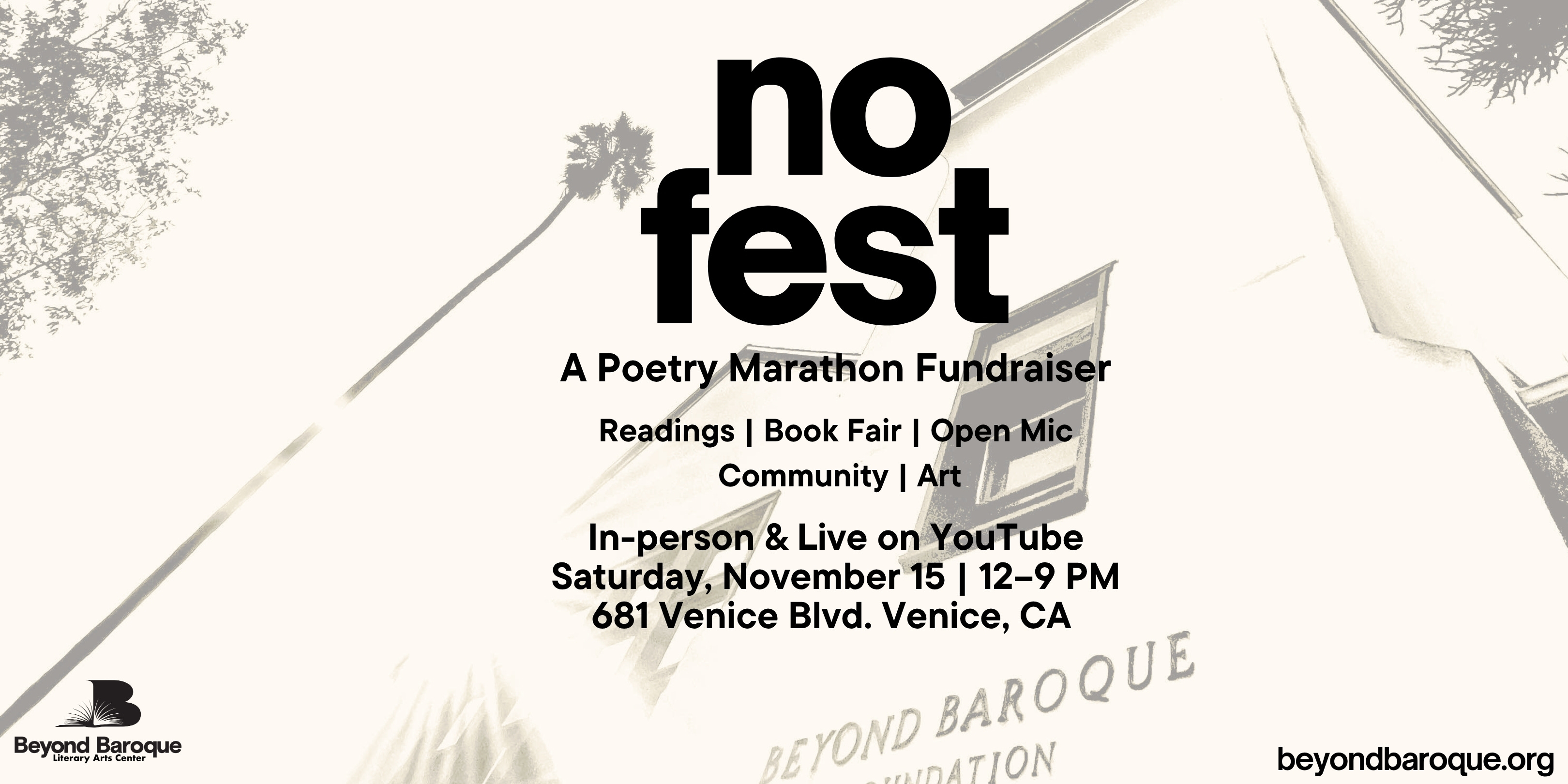 I’m excited to share that I’ll be reading with some incredible poets this Saturday (11/15) to support Beyond Baroque’s no fest, a poetry marathon fundraiser! It looks like there are at least 80 poets (!) performing, which is really kind of tremendous if you think about it. If you’re in LA and you’d like to stop by, I’ll be reading between 7-8PM. The event will also be live on YouTube from 12-9PM. There will also be an open mic from 12-1PM and a book fair set up inside the building featuring more than just a few of LA’s small presses, publications, & literary organizations.